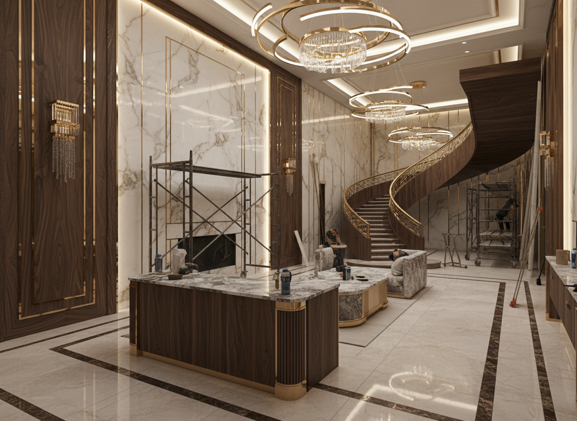 Thi công nội thất biệt thự tân cổ điển đòi hỏi tay nghề thợ cao, độ chính xác gần như tuyệt đối để đảm bảo tính thẩm mỹ và giá trị sang trọng của công trình.