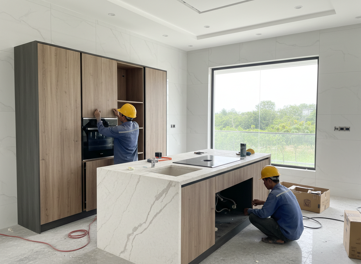 Các hạng mục tủ bếp, tủ quần áo, kệ tivi, cửa gỗ, vách gỗ sẽ được sản xuất trực tiếp tại xưởng, giúp kiểm soát chất lượng và tối ưu chi phí.