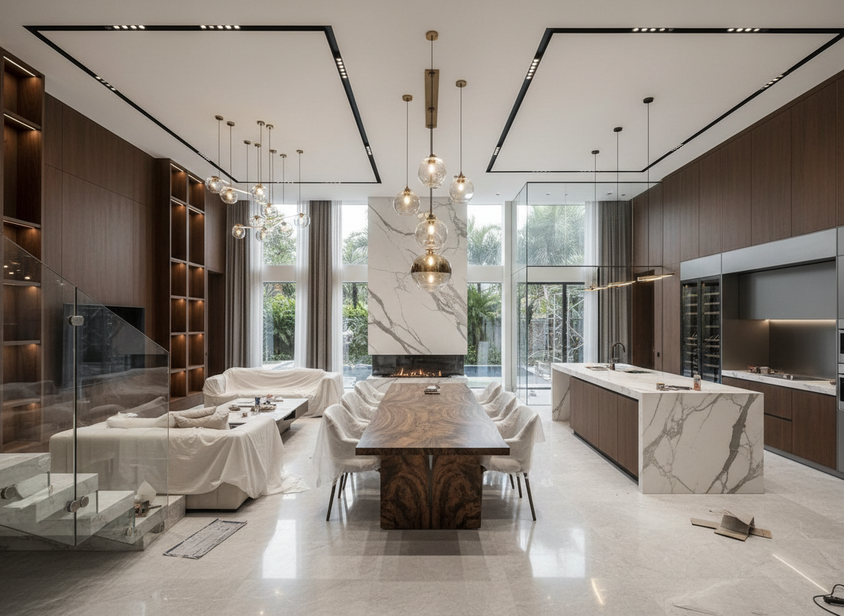 Thi công nội thất biệt thự cao cấp kết hợp vật liệu gỗ – đá – kim loại.
