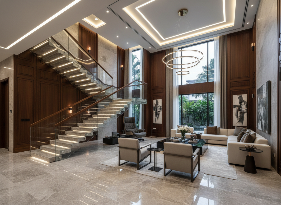 Thi công nội thất biệt thự luxury: Tập trung vào sự xa hoa, tinh xảo trong từng chi tiết, sử dụng vật liệu nhập khẩu, đá marble, kim loại mạ PVD, gỗ tự nhiên tuyển chọn.