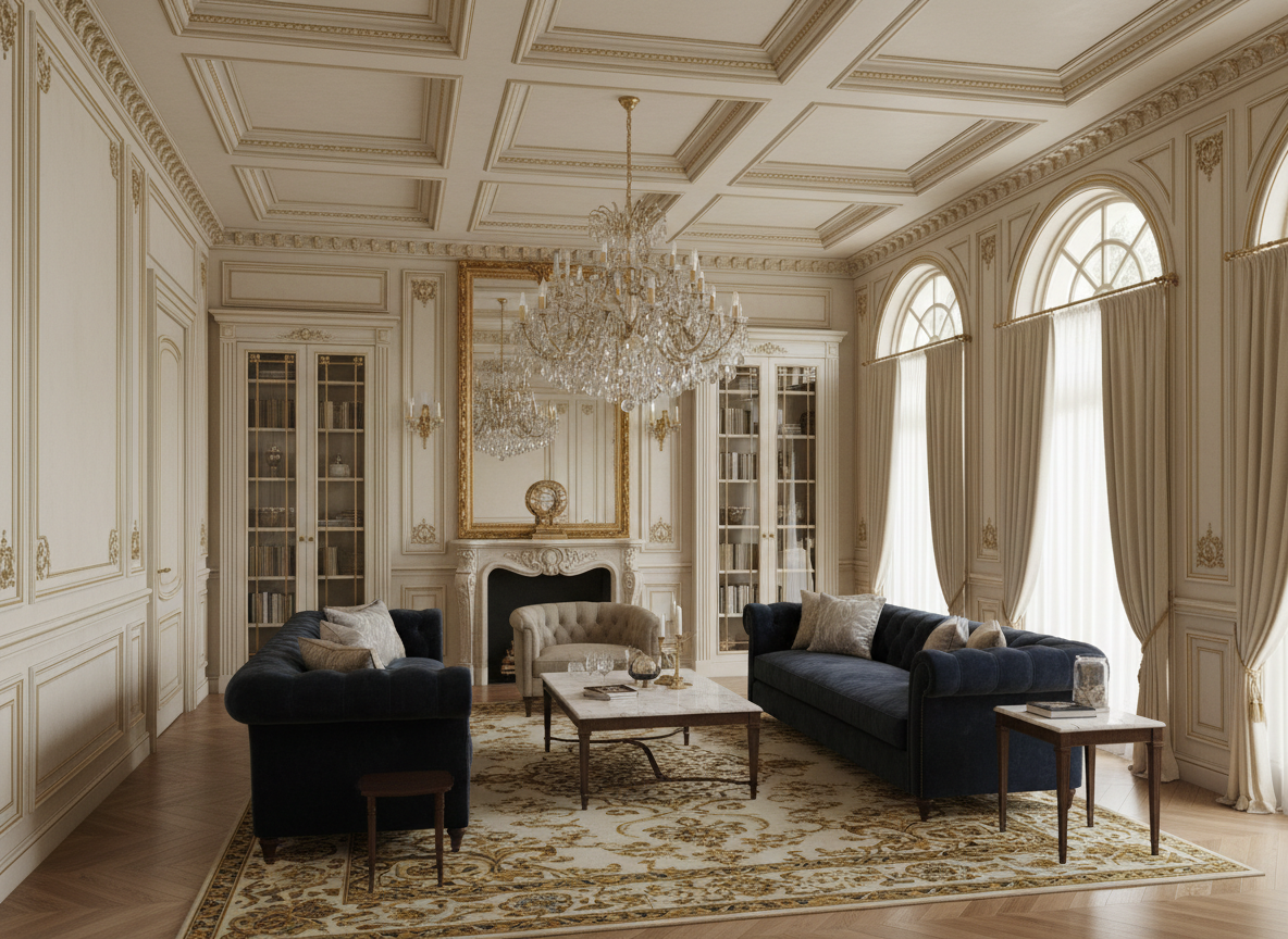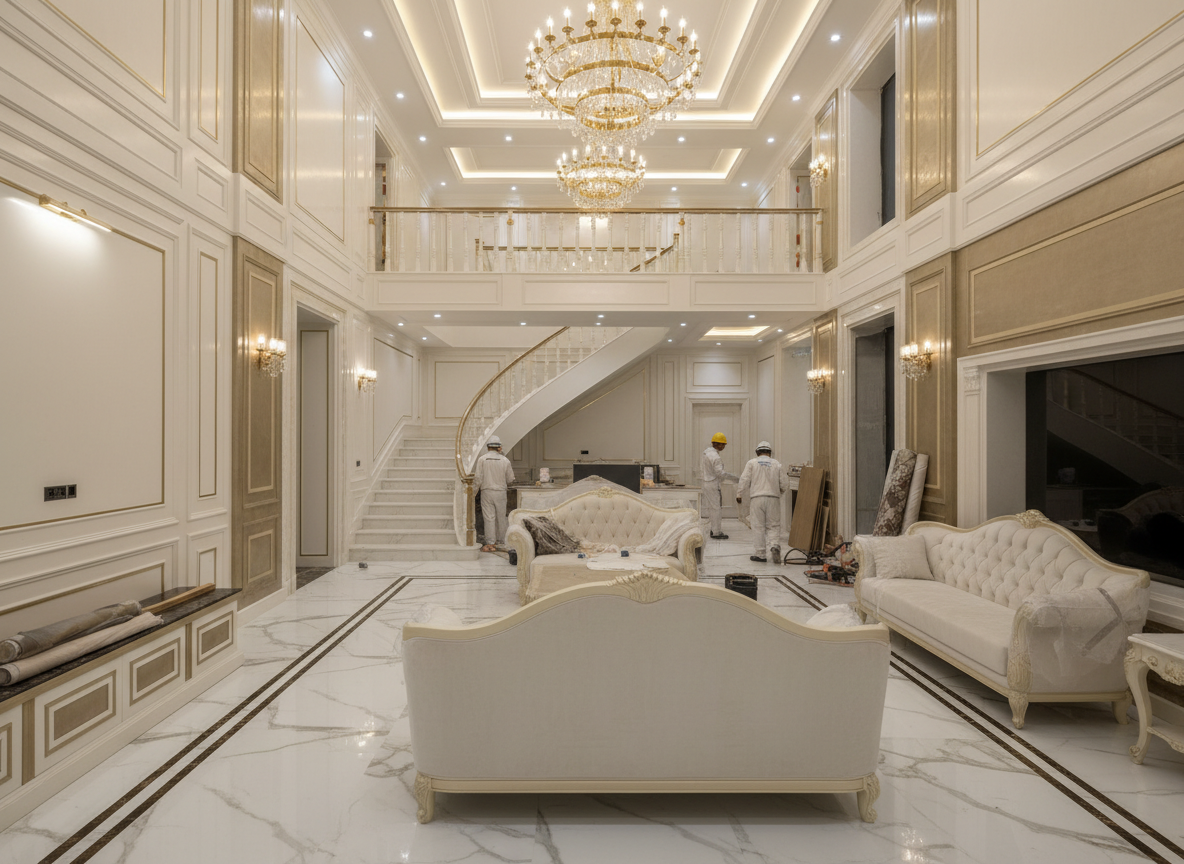Thi công nội thất biệt thự tân cổ điển: Kết hợp hài hòa giữa vẻ đẹp cổ điển sang trọng và sự tinh giản của phong cách hiện đại, sử dụng phào chỉ, đường cong mềm mại, màu sắc trung tính sang trọng.