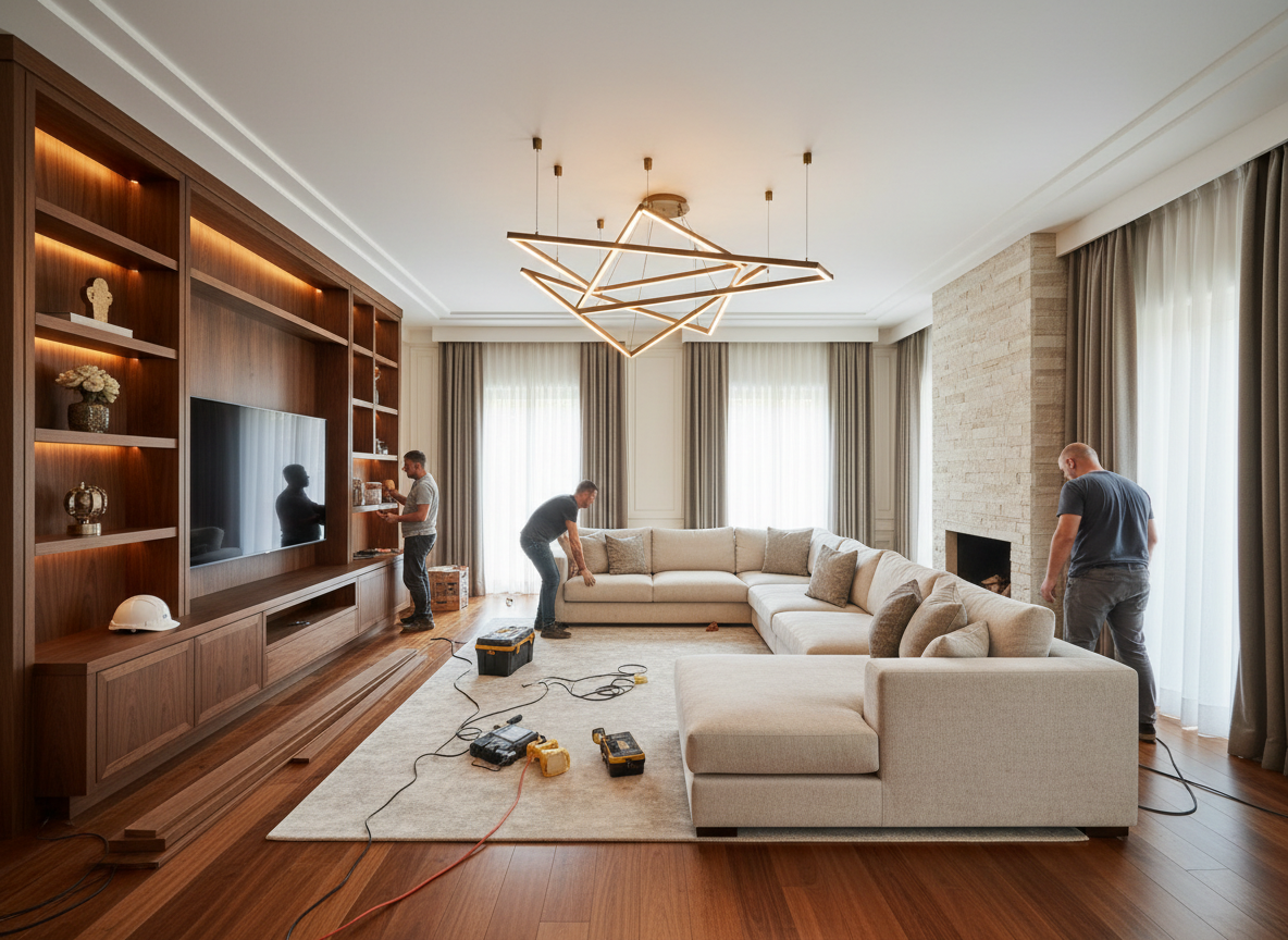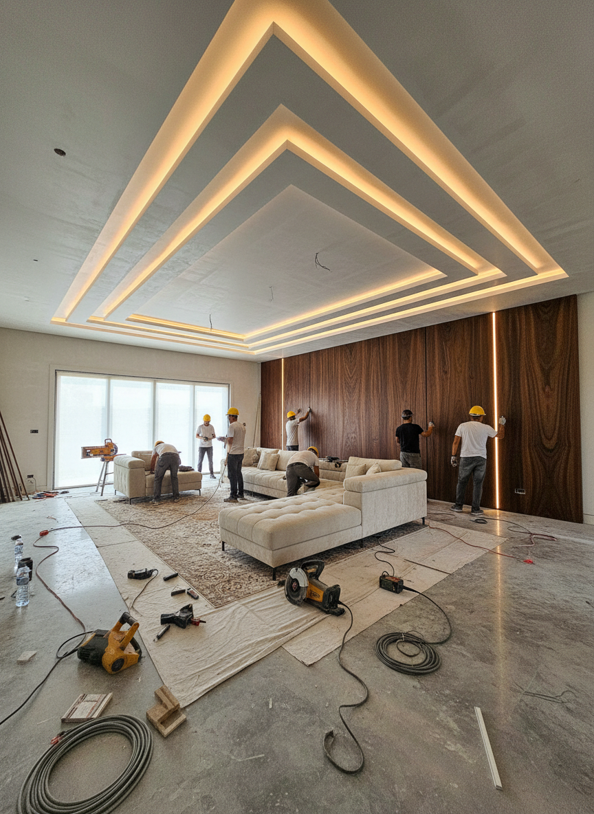 Thi công nội thất phòng khách: kệ tivi, sofa, tủ trang trí, vách ốp, trần thạch cao, hệ thống chiếu sáng.