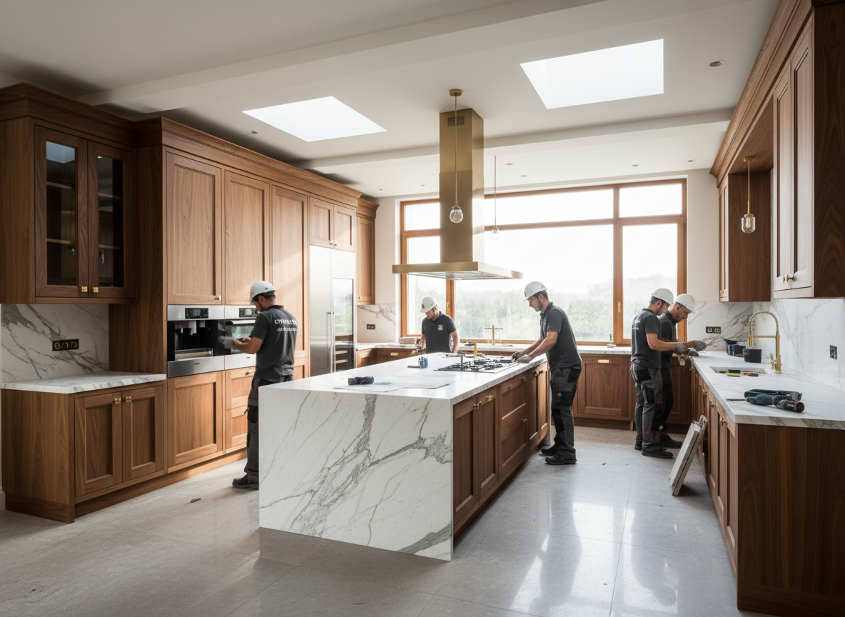 Thi công nội thất phòng bếp: tủ bếp, đảo bếp, quầy bar, thiết bị bếp.