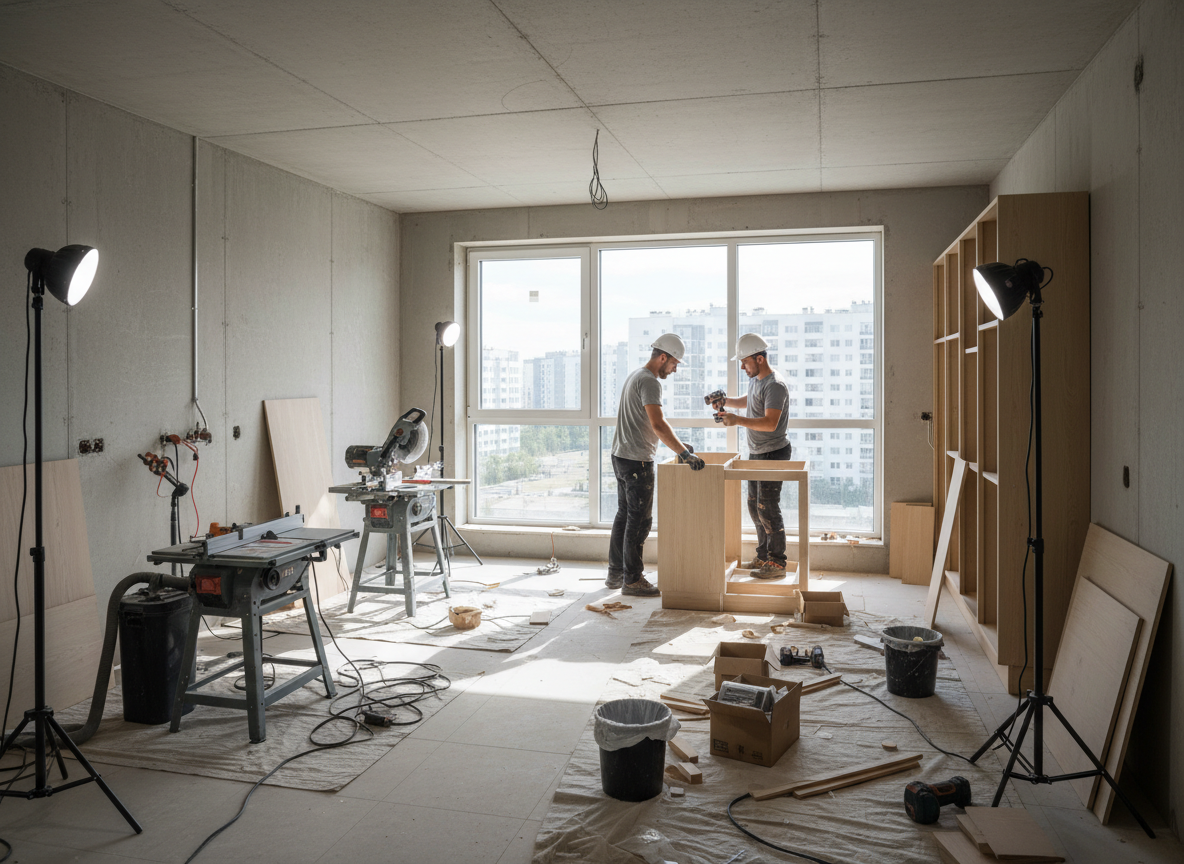 Thi công nội thất căn hộ chung cư là quá trình triển khai thực tế các hạng mục nội thất theo bản vẽ thiết kế đã được duyệt, bao gồm: sản xuất – vận chuyển – lắp đặt hệ thống tủ, giường, bàn ghế, kệ trang trí, vách ngăn, trần thạch cao, sàn, hệ thống điện nước âm tường, ánh sáng, rèm, thiết bị bếp, thiết bị vệ sinh…