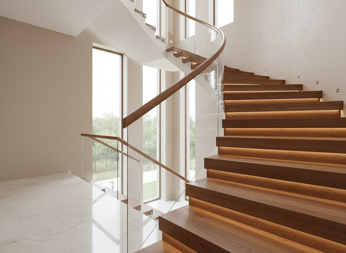 Trong năm 2025, xu hướng thi công nội thất cầu thang biệt thự tập trung vào các yếu tố: