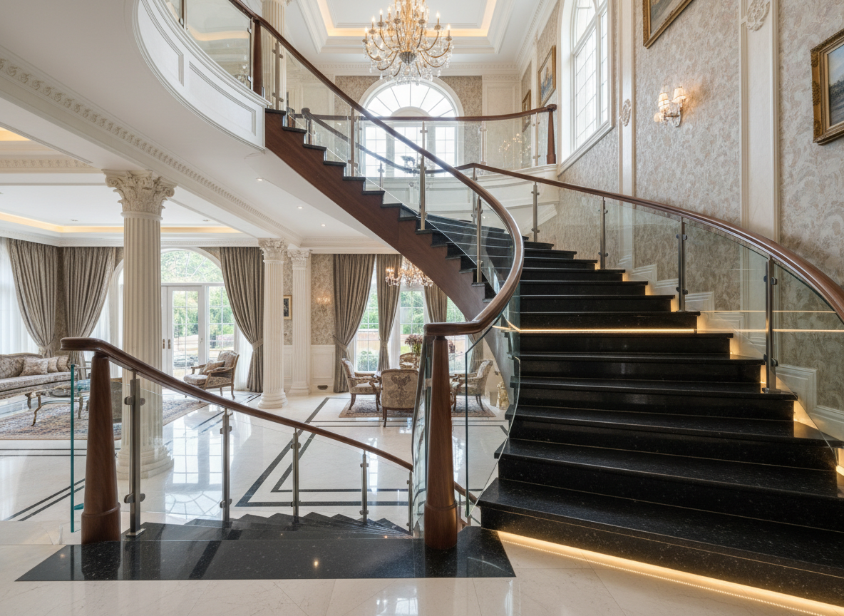 Phong cách tân cổ điển: Thường sử dụng cầu thang gỗ tự nhiên, lan can sắt uốn hoa văn tinh xảo, đá marble cao cấp.