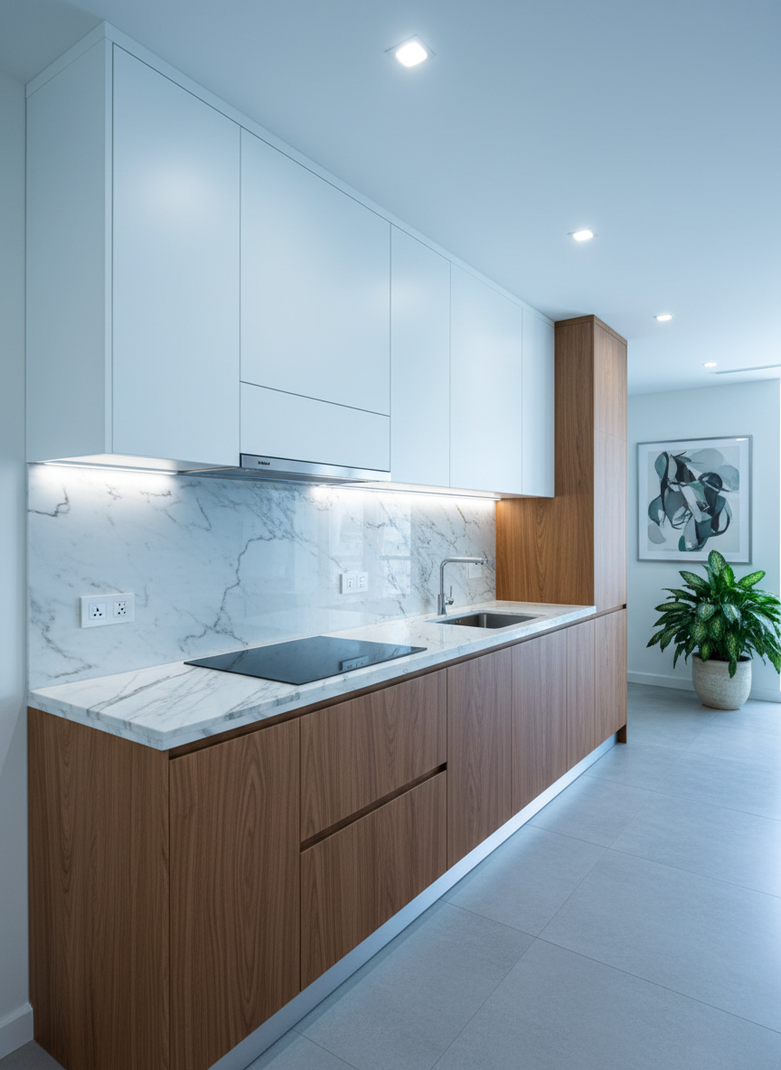 Bao gồm tủ bếp trên – dưới, bàn đảo, mặt đá bếp, kính ốp bếp, hệ thống thiết bị bếp, khoang lưu trữ thông minh, đảm bảo công năng tối ưu và an toàn khi sử dụng lâu dài.
