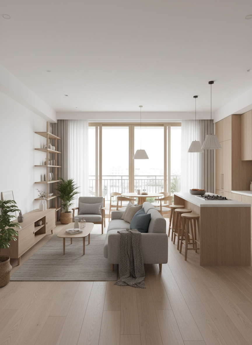 Ưa chuộng đường nét đơn giản, màu sắc trung tính, vật liệu gỗ công nghiệp kết hợp kính, đá, kim loại. Phù hợp với căn hộ vừa và nhỏ, tối ưu công năng sử dụng.