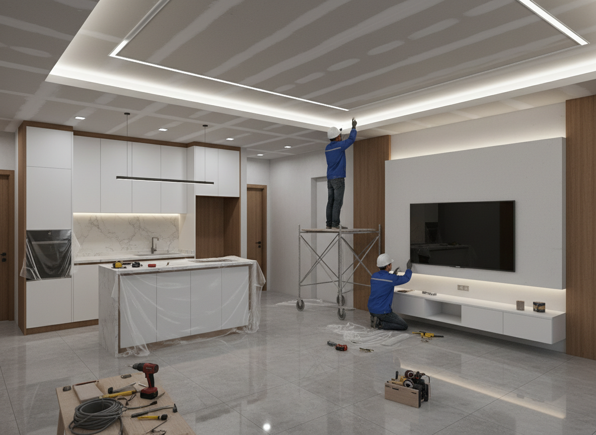 Bước đầu tiên là khảo sát thực tế căn hộ, đo đạc chính xác kích thước, kiểm tra hiện trạng hệ thống điện nước, trần, sàn, tường để đưa ra phương án thi công phù hợp.