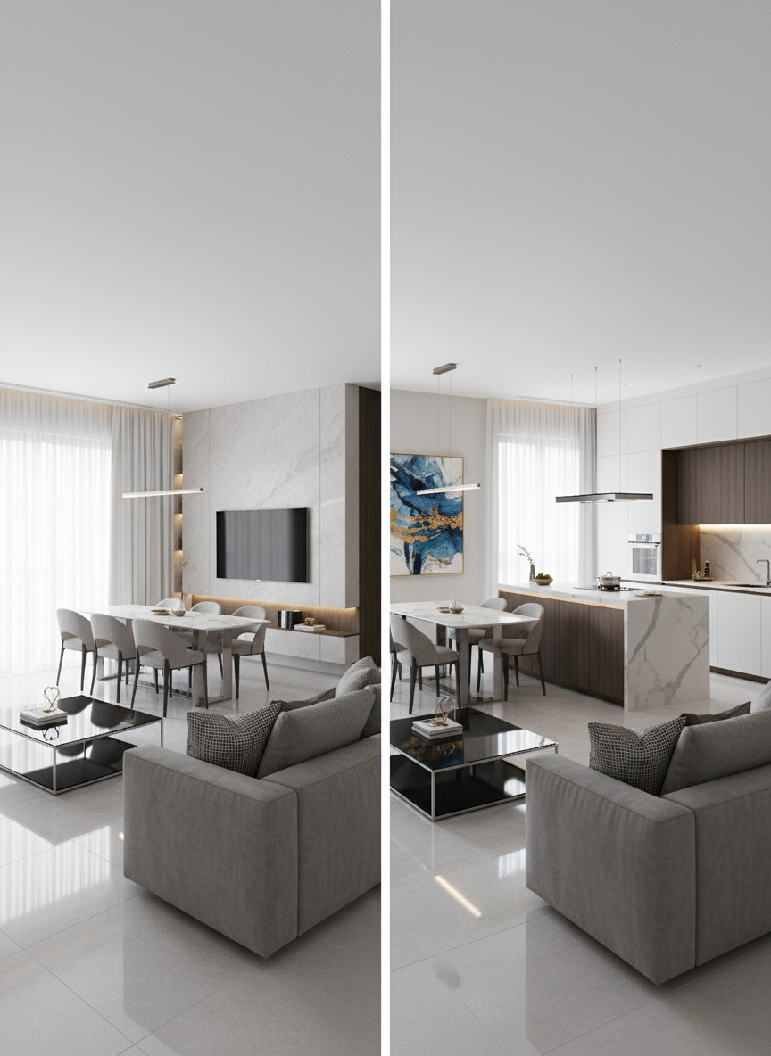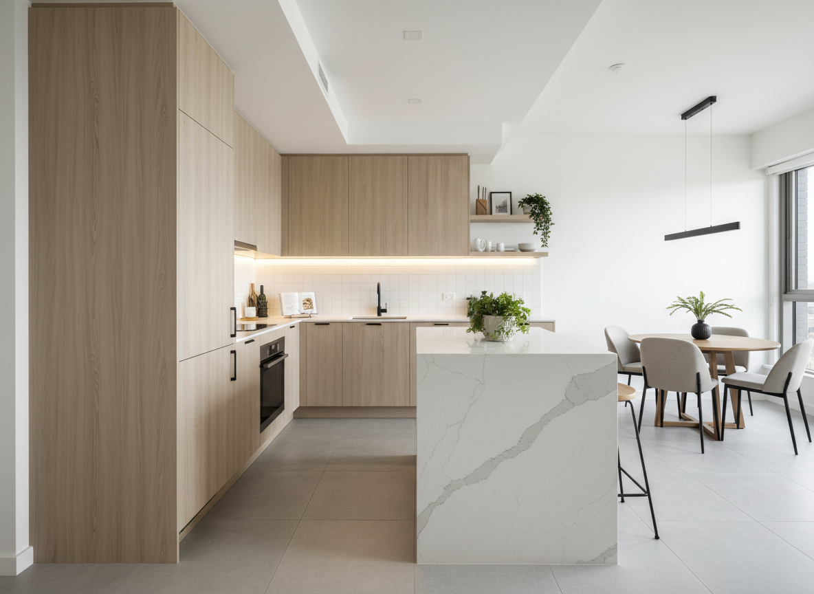 Việc kết hợp hài hòa các vật liệu giúp không gian chung cư vừa hiện đại, vừa bền đẹp theo thời gian.