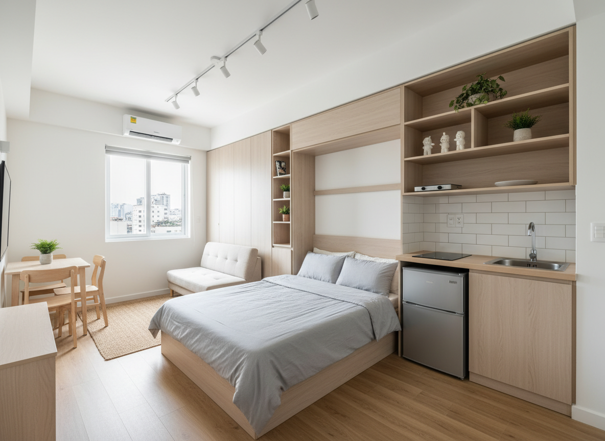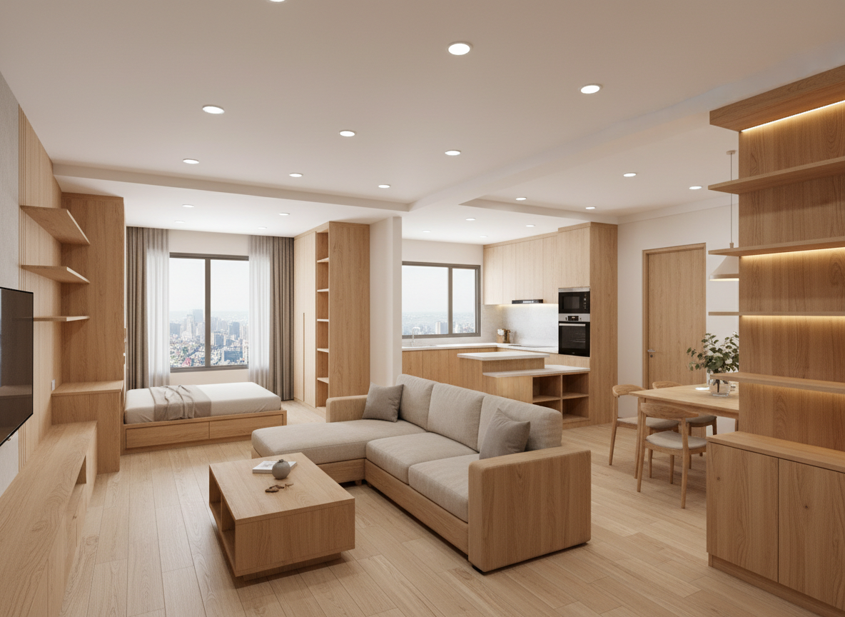 Ứng dụng nội thất thông minh, đa năng, tiết kiệm diện tích như giường gấp, tủ âm tường, bàn ăn gấp gọn.