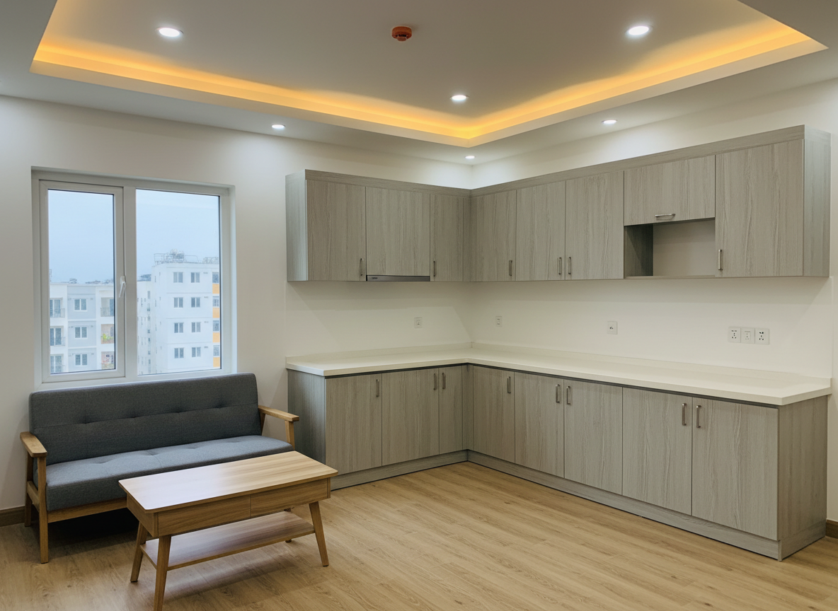 Vật liệu sử dụng: Gỗ công nghiệp MDF thường, MDF chống ẩm, HDF, gỗ tự nhiên, đá nhân tạo, đá tự nhiên, mặt bếp acrylic, laminate, melamine… mỗi loại có mức giá và độ bền khác nhau. Muốn thi công nội thất chung cư giá rẻ ở TPHCM, lựa chọn vật liệu phù hợp là yếu tố then chốt.