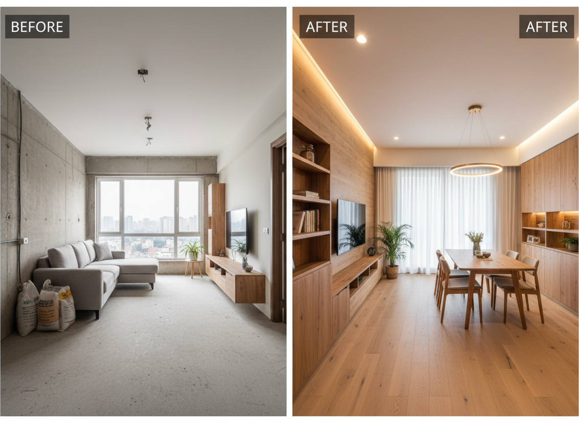 Với mô hình thi công nội thất khép kín, từ thiết kế – sản xuất – lắp đặt đều do một đơn vị phụ trách, tiến độ được kiểm soát chặt chẽ và tối ưu hơn. Thông thường, thời gian thi công nội thất chung cư giá xưởng tại TPHCM chỉ dao động từ 20 – 35 ngày tùy quy mô và độ phức tạp.