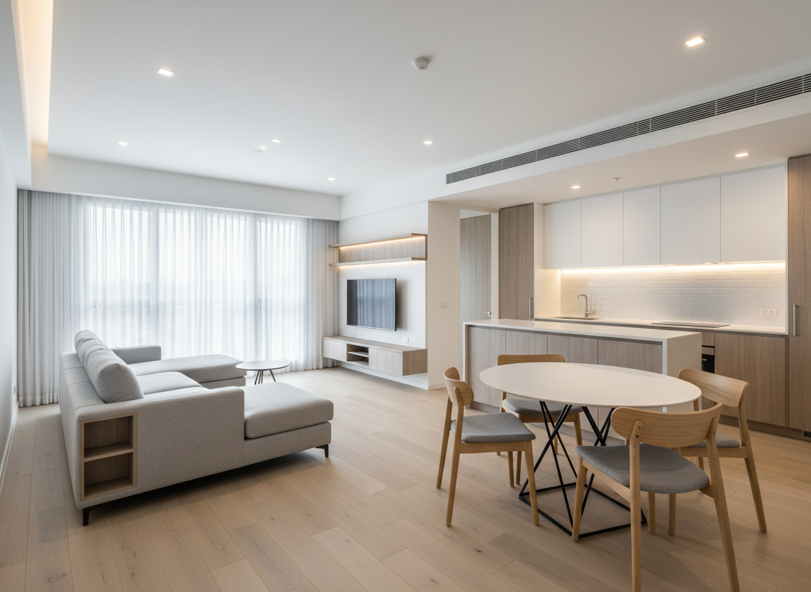 Dịch vụ thi công nội thất chung cư giá xưởng thường bao gồm trọn gói toàn bộ không gian từ phòng khách, phòng bếp, phòng ngủ đến khu vực vệ sinh và ban công.