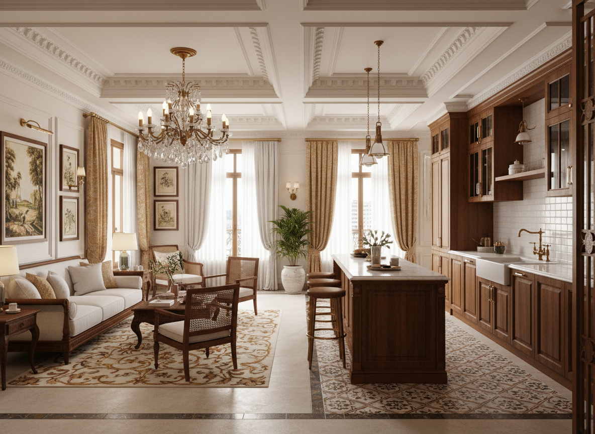 Thứ nhất là màu sắc. Các gam màu thường sử dụng bao gồm trắng kem, vàng nhạt, nâu gỗ, xanh ngọc, đen tuyền… Đây đều là những gam màu mang tính cổ điển, sang trọng, tạo cảm giác ấm áp nhưng vẫn đủ độ tương phản để làm nổi bật từng không gian.
