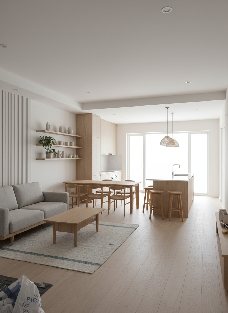 • Hoàn thiện trang trí: rèm cửa, giấy dán tường, đèn trang trí, phụ kiện decor.