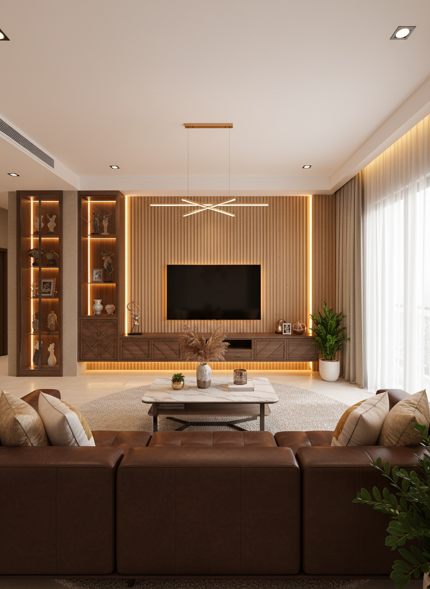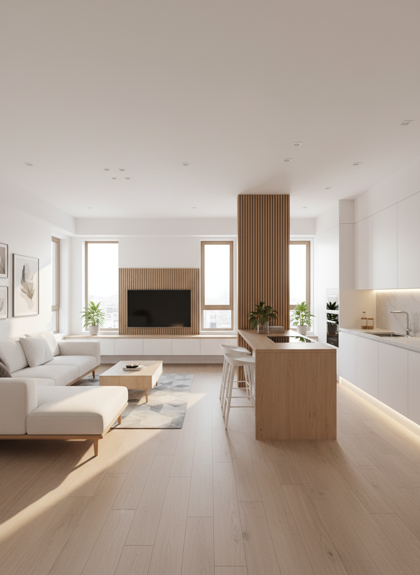 Phòng khách là không gian trung tâm của căn hộ, nơi tiếp đón khách và sinh hoạt chung của cả gia đình. Hạng mục thi công thường bao gồm kệ tivi, vách trang trí, tủ giày, sofa, bàn trà, hệ tủ trang trí kết hợp đèn chiếu sáng để tạo điểm nhấn thẩm mỹ và tăng chiều sâu không gian.