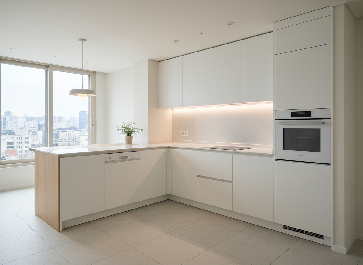 Phòng bếp phong cách Hàn ưu tiên thiết kế gọn gàng, sạch sẽ, dễ lau chùi. Tủ bếp chữ I hoặc chữ L là lựa chọn tối ưu cho chung cư. Màu sắc tủ bếp thường là trắng, kem hoặc xám nhạt kết hợp mặt đá sáng màu để tăng độ sang trọng.