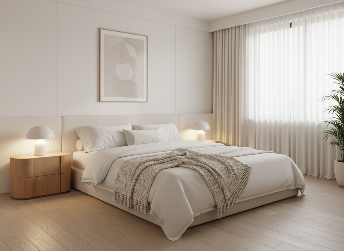 Gam màu chủ đạo trong phòng ngủ thường là trắng – be – pastel kết hợp ánh sáng vàng dịu để tạo cảm giác dễ ngủ, thoải mái. Rèm cửa hai lớp vừa điều tiết ánh sáng, vừa tăng tính thẩm mỹ cho căn phòng.