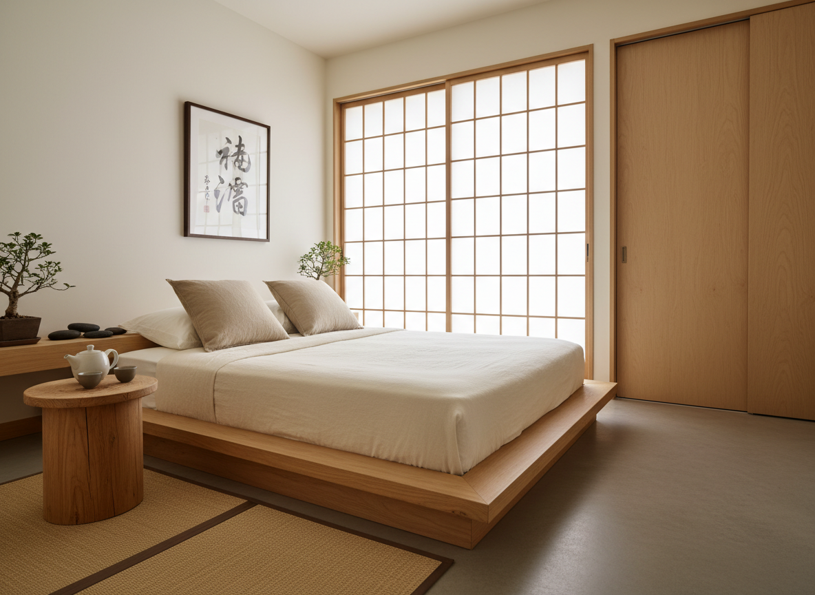 Phòng ngủ phong cách Nhật là không gian thể hiện rõ nhất triết lý sống tối giản và thiền định. Khi thi công phòng ngủ chung cư phong cách Nhật, giường ngủ thường được thiết kế thấp, gần sàn, giúp tạo cảm giác an toàn và dễ chịu.