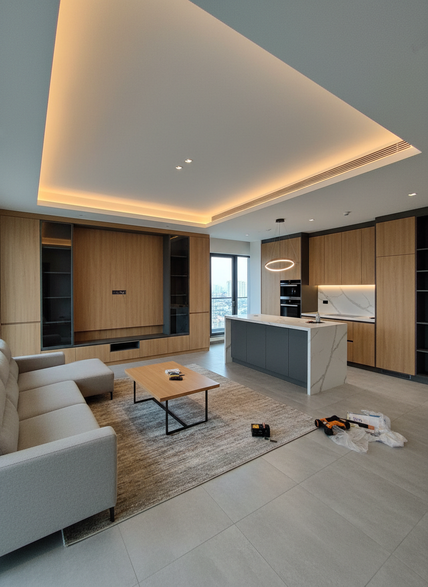 Quá trình thi công nội thất căn hộ tại Quận 1 thường được triển khai theo từng hạng mục rõ ràng, đảm bảo tính khoa học và tiến độ công trình: