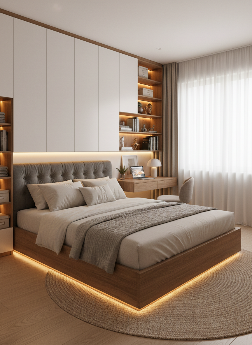 Thi công nội thất phòng ngủ bao gồm giường ngủ, tủ áo, bàn trang điểm, kệ tivi, rèm cửa, vách đầu giường, sàn gỗ hoặc thảm trải sàn, hệ chiếu sáng thư giãn.