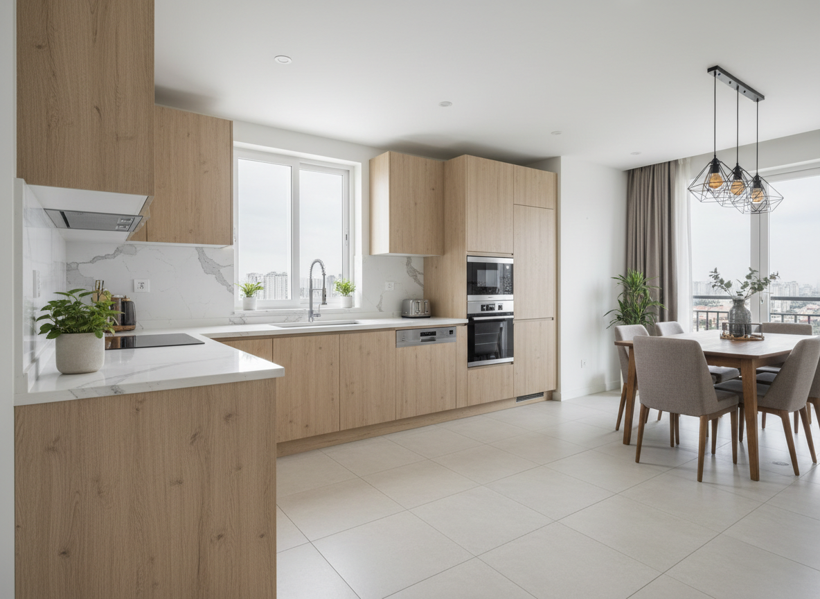 Khu vực bếp – ăn là nơi có yêu cầu cao về công năng và độ bền. Thi công nội thất bếp chung cư quận 2 thường sử dụng các vật liệu chống ẩm, chống mối mọt, dễ vệ sinh như MDF lõi xanh chống ẩm, HDF, gỗ công nghiệp phủ Melamine, Laminate hoặc Acrylic. Hệ tủ bếp được thiết kế thông minh, tích hợp phụ kiện hiện đại giúp tối ưu không gian lưu trữ và thuận tiện trong quá trình sử dụng.