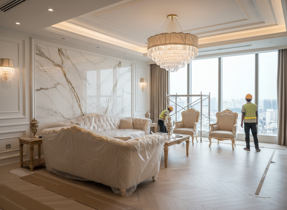 Thứ hai là yêu cầu về kỹ thuật và an toàn trong quá trình vận chuyển vật tư, vật liệu, máy móc lên căn hộ. Các công trình chung cư đều có hệ thống thang máy, hành lang, lối thoát hiểm cần được bảo vệ nghiêm ngặt, do đó quá trình thi công phải tuân thủ tuyệt đối quy định của ban quản lý. Thứ ba là đặc điểm về diện tích, nhiều căn hộ có diện tích không quá lớn nên việc thi công nội thất cần chú trọng vào giải pháp tối ưu không gian, tận dụng từng mét vuông để mang lại sự thông thoáng và tiện nghi.