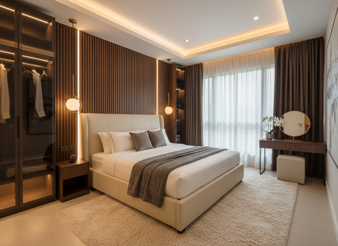 Phòng ngủ là nơi tái tạo năng lượng sau mỗi ngày dài làm việc, vì vậy trong thi công nội thất chung cư sang trọng, không gian này luôn được đầu tư kỹ lưỡng về sự yên tĩnh, riêng tư và cảm giác thư giãn. Giường ngủ bọc da hoặc nỉ cao cấp, hệ tủ quần áo âm tường sát trần, bàn trang điểm thiết kế tinh tế, hệ rèm cửa điều khiển tự động và ánh sáng dịu nhẹ là những yếu tố không thể thiếu trong phòng ngủ sang trọng.
