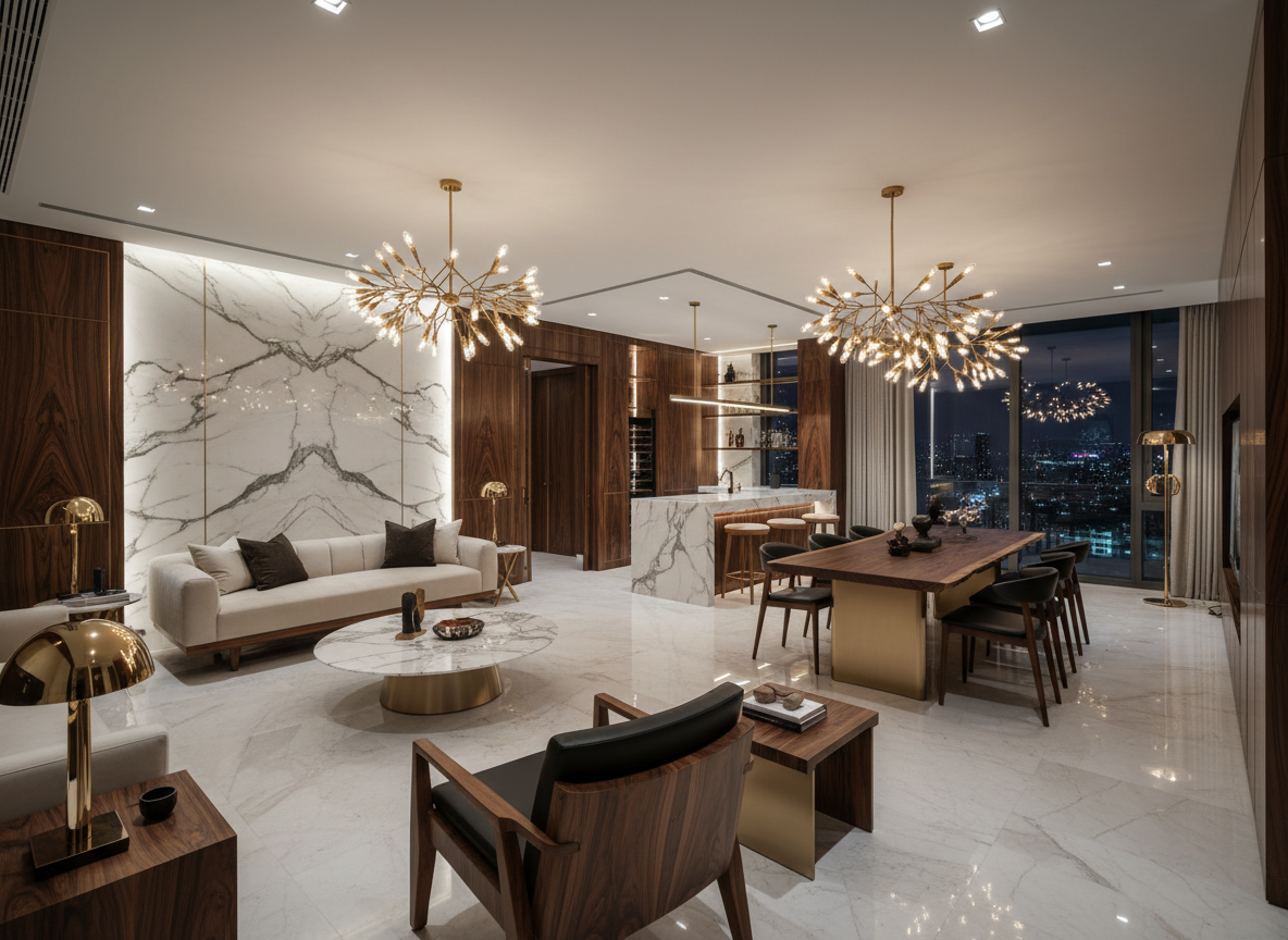 Vật liệu là yếu tố then chốt quyết định đến chất lượng và đẳng cấp của không gian nội thất. Trong thi công nội thất chung cư sang trọng, các vật liệu thường được sử dụng bao gồm gỗ óc chó, gỗ sồi Mỹ, đá marble nhập khẩu, đá onyx xuyên sáng, kính siêu trong, kim loại mạ titan, da thật cao cấp cùng các vật liệu hoàn thiện bề mặt như veneer tự nhiên, acrylic bóng gương, laminate chống trầy xước.
