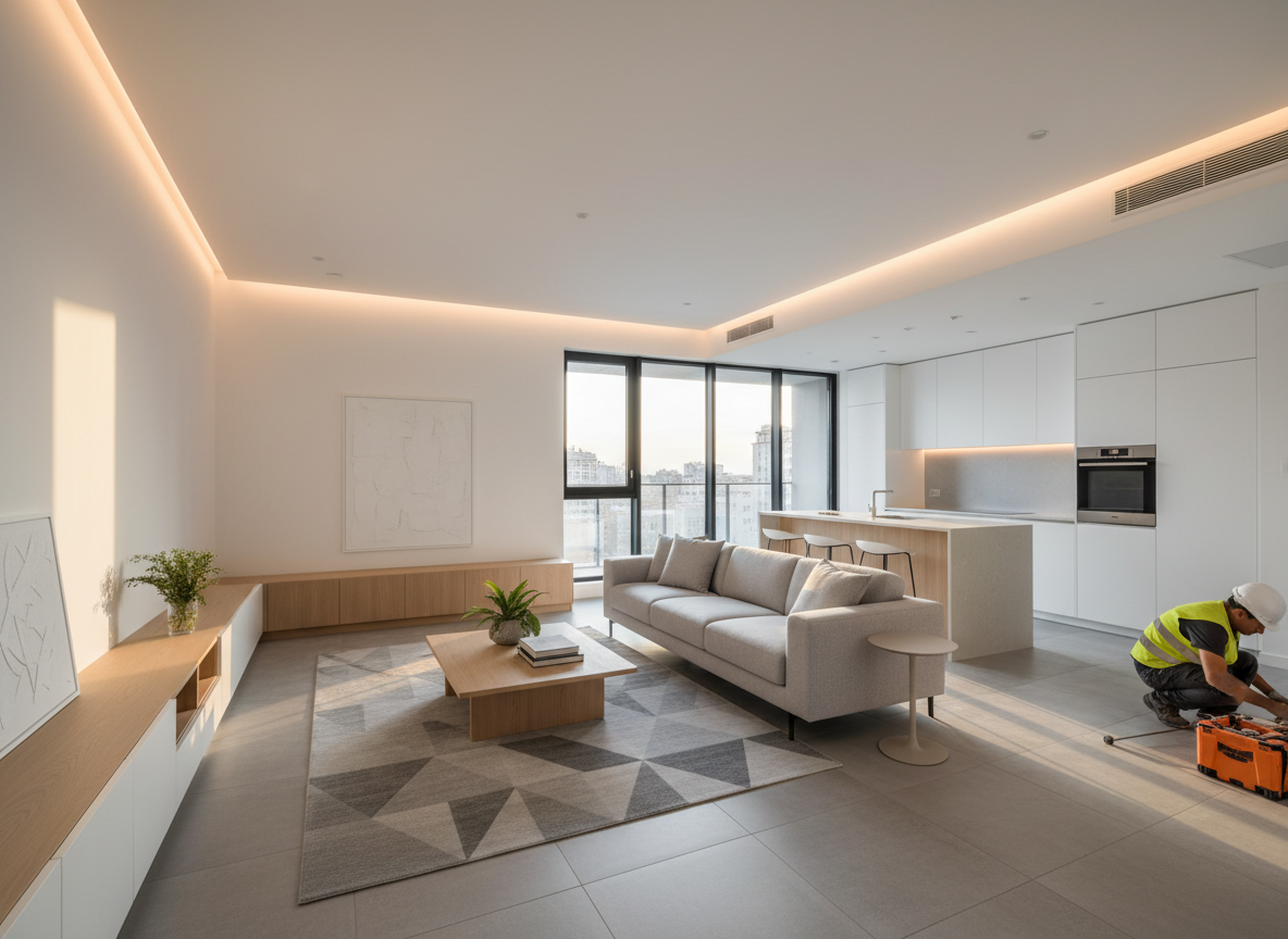 Một quy trình thi công nội thất chung cư tối giản bài bản và chuyên nghiệp luôn bắt đầu từ bước khảo sát hiện trạng căn hộ, đo đạc chính xác kích thước, kiểm tra hệ kết cấu, hệ thống điện – nước – trần – tường để đưa ra phương án thi công phù hợp với thực tế.