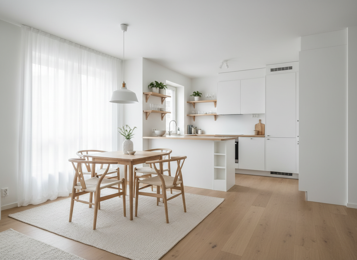 Tông trắng, gỗ sáng.