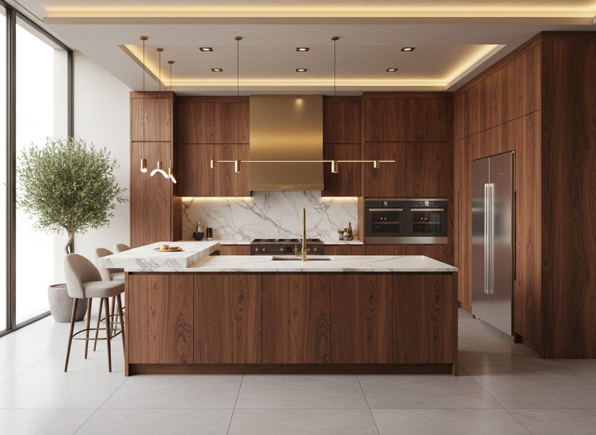 Hệ tủ bếp gỗ tự nhiên không chỉ đẹp mà còn bền bỉ trước nhiệt độ và độ ẩm cao. Các loại gỗ như gõ đỏ, sồi, óc chó được ưu tiên nhờ khả năng chống mối mọt và chịu lực tốt.