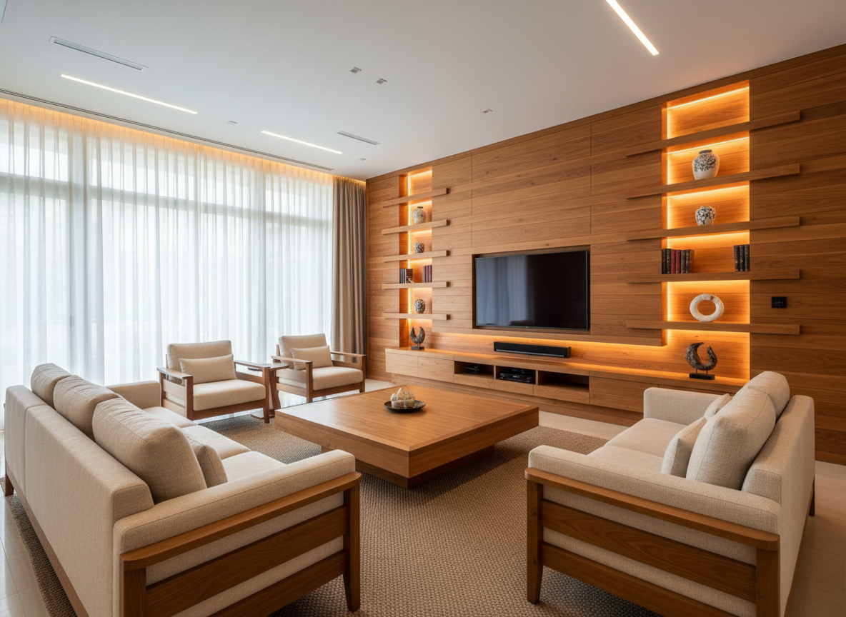 Phòng khách là “bộ mặt” của biệt thự. Các hạng mục thường gồm: bộ sofa gỗ tự nhiên, kệ tivi gỗ, vách ốp tường, trần gỗ, bàn trà, tủ trang trí. Sự kết hợp tinh tế giữa ánh sáng và vân gỗ giúp không gian trở nên ấm cúng nhưng vẫn vô cùng đẳng cấp.