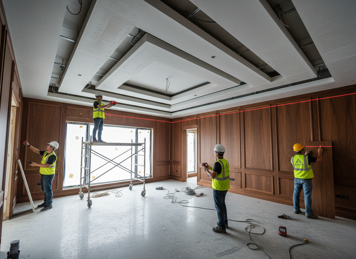 Trước khi thi công, đội ngũ kỹ thuật phải khảo sát toàn bộ không gian 4 tầng: kích thước phòng, đường điện nước, vị trí dầm, tường, cửa sổ, ánh sáng tự nhiên để đưa ra phương án thi công tối ưu. Việc đo đạc chính xác quyết định độ khớp khi lắp đặt nội thất về sau.