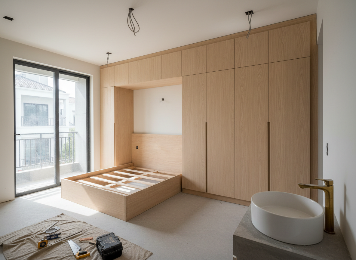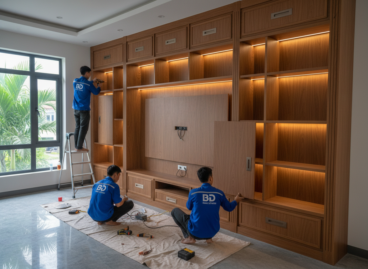 - Thi công – lắp đặt là bước quan trọng nhất để biến bản vẽ thành công trình thực tế. Các hạng mục như thi công tủ bếp, tủ quần áo, giường, kệ tivi, bàn ăn, quầy bar, trang trí tường, lam gỗ, ốp PVC, hệ đèn chiếu sáng… cần đội ngũ có tay nghề cao để đạt tính thẩm mỹ và độ bền lâu dài.