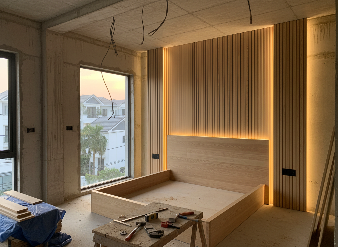Thi công tủ quần áo âm tường, tab đầu giường, bàn làm việc, kệ trang trí. Tối ưu ánh sáng và lưu trữ giúp không gian thoáng và thư giãn.
