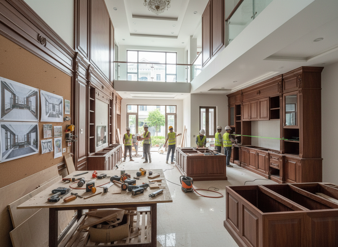 Phần sản xuất nội thất được thực hiện tại xưởng với hệ thống máy móc hiện đại giúp độ chính xác cao, sắc nét và thẩm mỹ vượt trội. Cuối cùng là giai đoạn lắp đặt tại nhà và bàn giao, nơi các thợ thi công tiến hành lắp đặt đúng bản vẽ, căn chỉnh từng chi tiết nhỏ và hoàn thiện toàn bộ công trình.