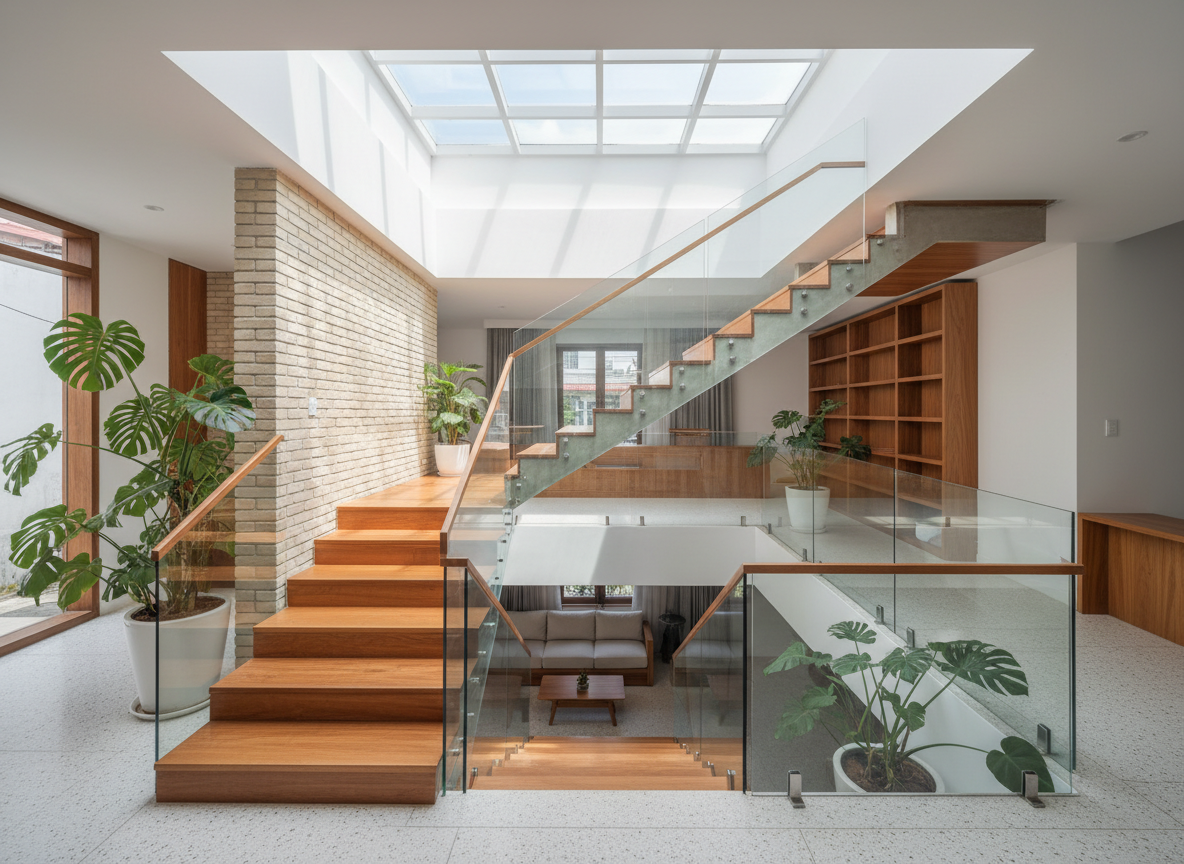 Cầu thang và giếng trời là nơi mang ánh sáng tự nhiên vào nhà phố. Thi công khu vực này thường bao gồm tay vịn gỗ, kính cường lực, ốp gỗ, lam trang trí hoặc các mảng xanh tạo điểm nhấn. Khi được thi công đúng kỹ thuật, không gian nhà phố sẽ trở nên thông thoáng và rộng mở hơn rất nhiều.