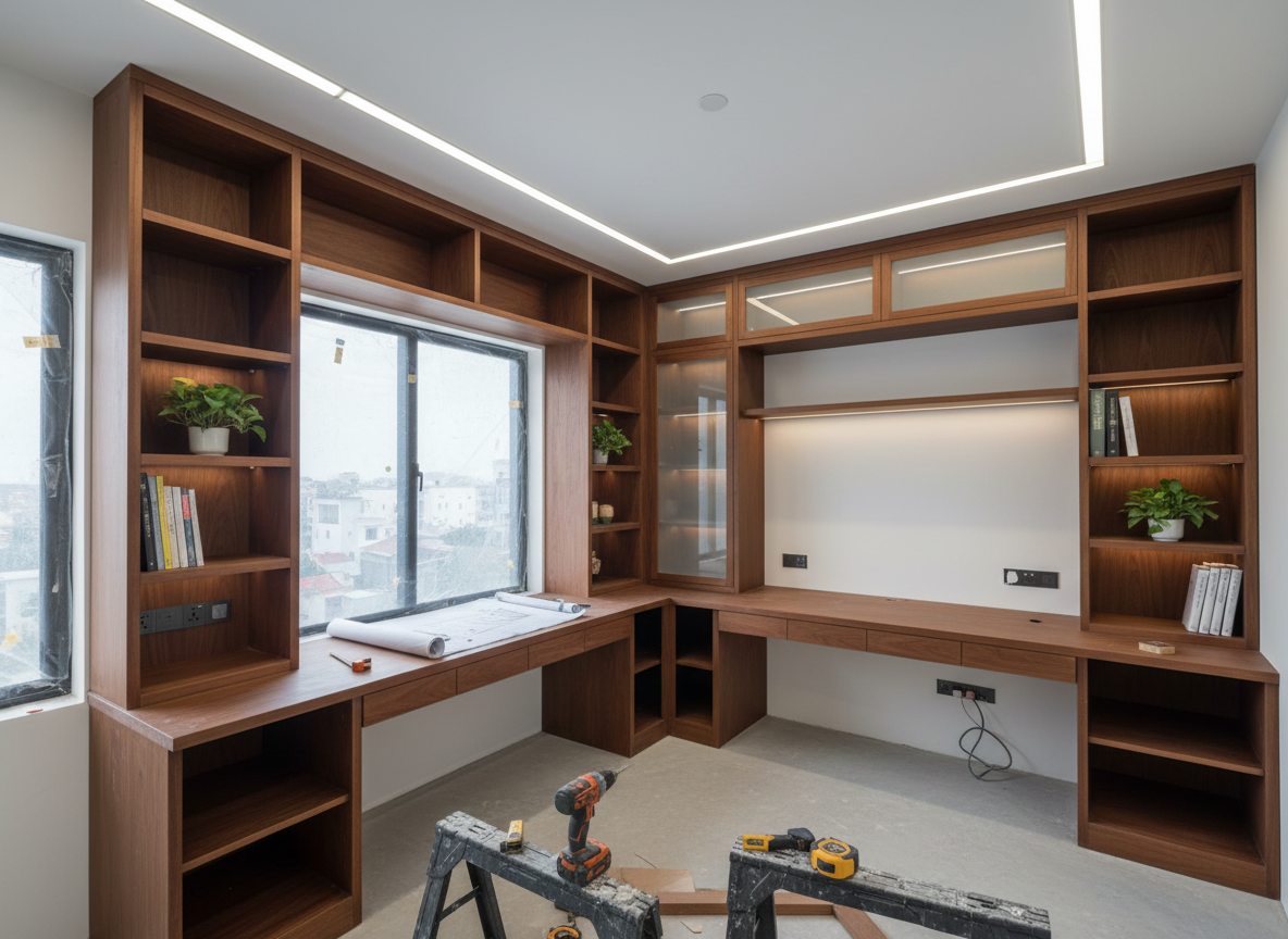 Sau khảo sát, đơn vị thi công sẽ tư vấn vật liệu phù hợp với ngân sách và nhu cầu của gia chủ. Gỗ MDF chống ẩm phủ Melamine, gỗ HDF, gỗ sồi tự nhiên, kính cường lực, đá granite… đều được lựa chọn dựa trên tính bền, an toàn, thẩm mỹ và khả năng chịu lực trong điều kiện khí hậu thực tế.