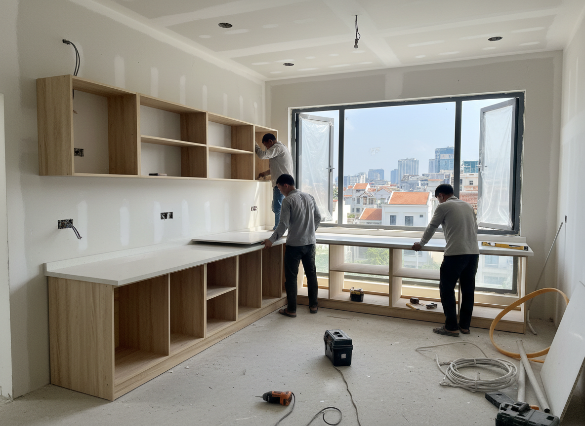 Cuối cùng là nghiệm thu – bàn giao. Kỹ thuật sẽ căn chỉnh từng cánh tủ, khe hở, kiểm tra ray kéo, bản lề, độ phẳng của tủ, độ chắc chắn của bàn, giường… và vệ sinh toàn bộ khu vực trước khi bàn giao cho gia chủ. Quy trình rõ ràng này đảm bảo công trình hoàn thiện đúng bản vẽ, đúng tiến độ và đạt chất lượng cao nhất.