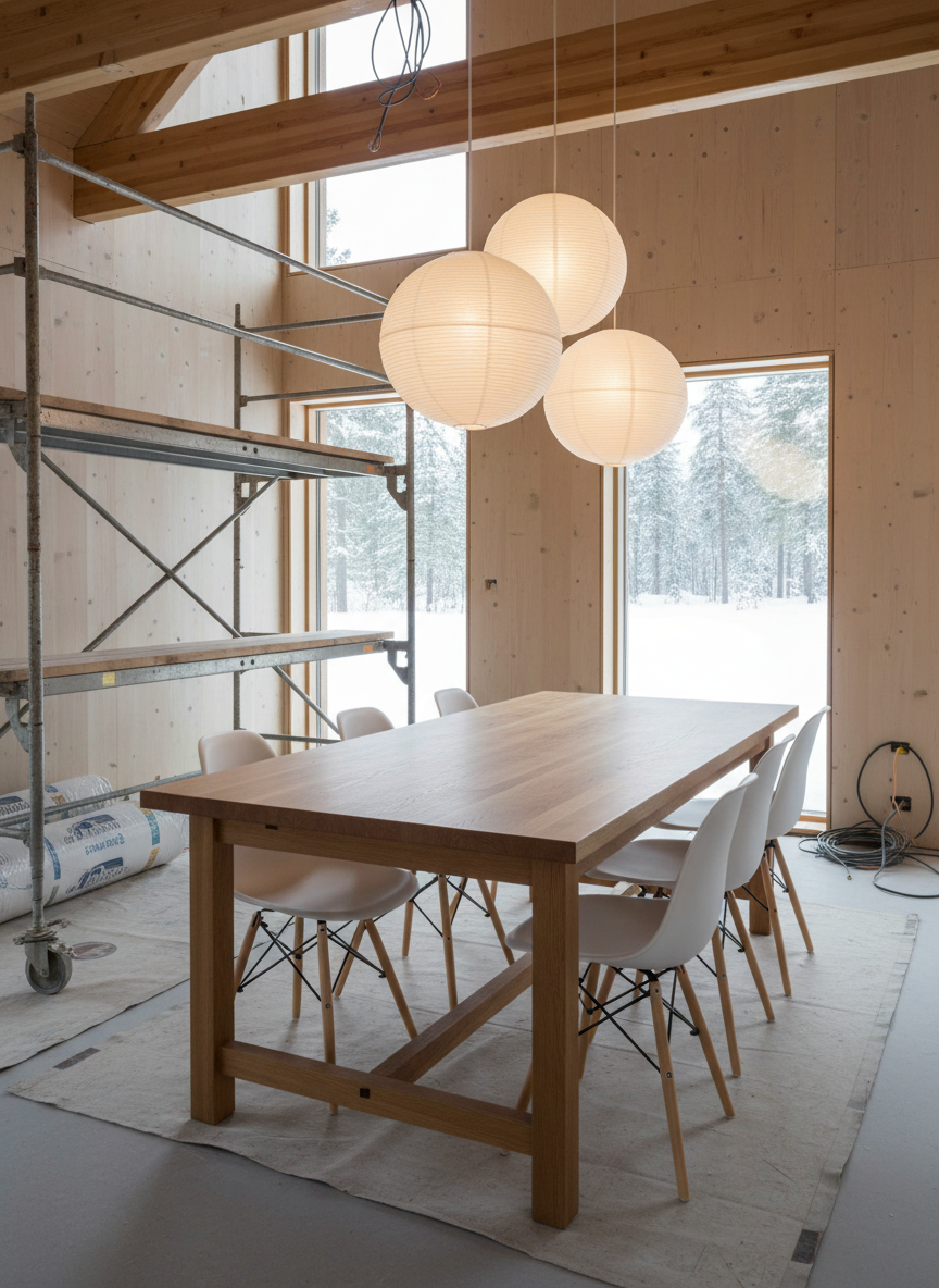 Ánh sáng là “linh hồn” của phong cách Scandinavian. Khi thi công thực tế, đội ngũ kỹ thuật sẽ tính toán từng vị trí đèn thả, đèn rọi ray, đèn led hắt tường để tạo cảm giác ấm áp nhưng không tối. Không gian Bắc Âu không lạm dụng ánh sáng trắng, thay vào đó sử dụng ánh sáng vàng nhẹ để làm nổi bật đồ nội thất bằng gỗ.