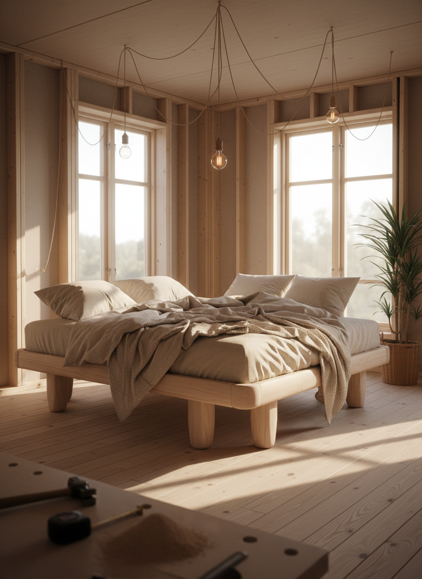 Nội thất tối giản: giường gỗ thấp, tab đầu giường nhẹ nhàng, tủ áo cánh phẳng, đèn ngủ ánh sáng ấm, rèm hai lớp nhẹ nhàng.