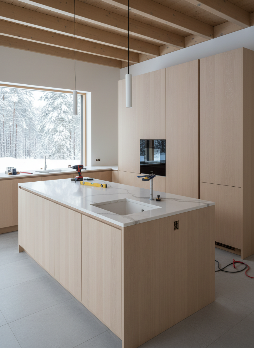 Các kỹ sư sẽ đo đạc kỹ trước khi sản xuất tại xưởng, đảm bảo từng món nội thất khớp tuyệt đối với không gian. Những chi tiết nhỏ như bản lề giảm chấn, ray kéo âm, tay nắm gỗ đều phải được lựa chọn kỹ để phù hợp tổng thể. Sự tinh tế đến từ những chi tiết tưởng chừng nhỏ này là điểm làm nên sự hoàn hảo cho không gian Bắc Âu.