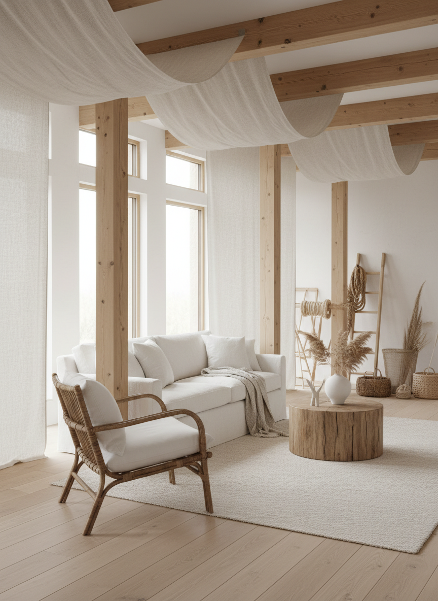 Ngoài ánh sáng, chất liệu là yếu tố quan trọng. Nội thất gỗ MDF chống ẩm phủ Melamine màu gỗ sồi sáng là lựa chọn phổ biến nhất nhờ giá thành hợp lý và độ bền cao. Sàn gỗ hoặc sàn nhựa giả gỗ tone sáng giúp không gian liền mạch hơn. Rèm cửa hai lớp màu trắng kem, sofa vải bố, thảm lông mềm và vài chi tiết mây tre là đủ để tạo phong cách Bắc Âu mà không tốn kém. Thi công đúng loại vật liệu đúng vị trí giúp không gian bền, đẹp và tiết kiệm chi phí bảo trì về sau.