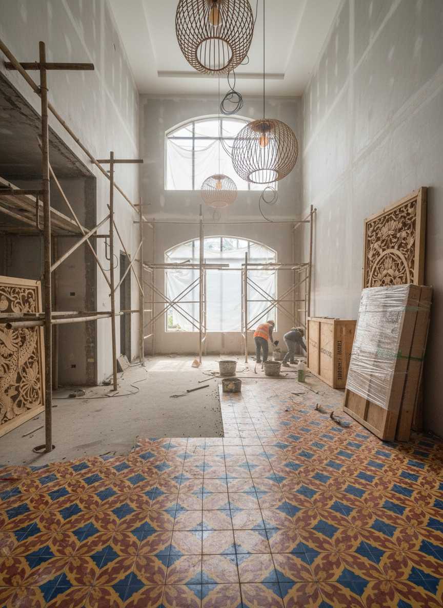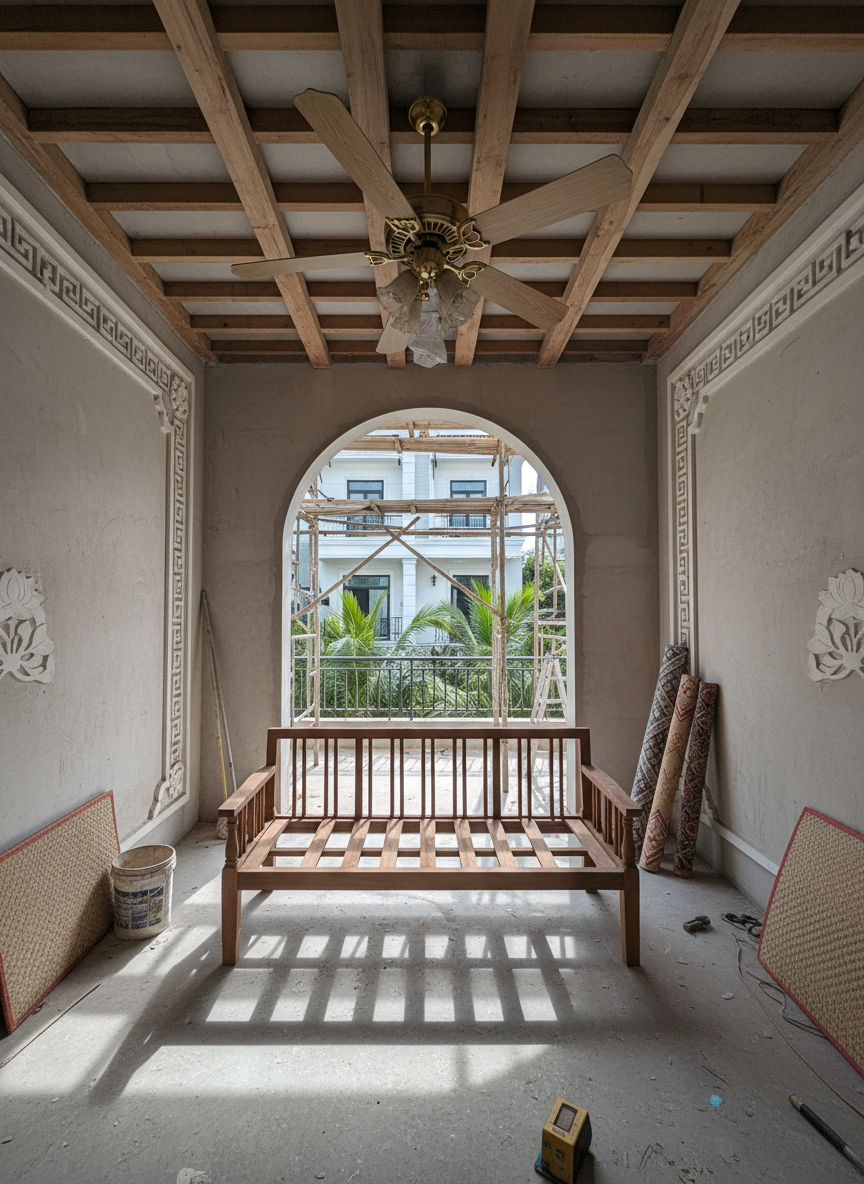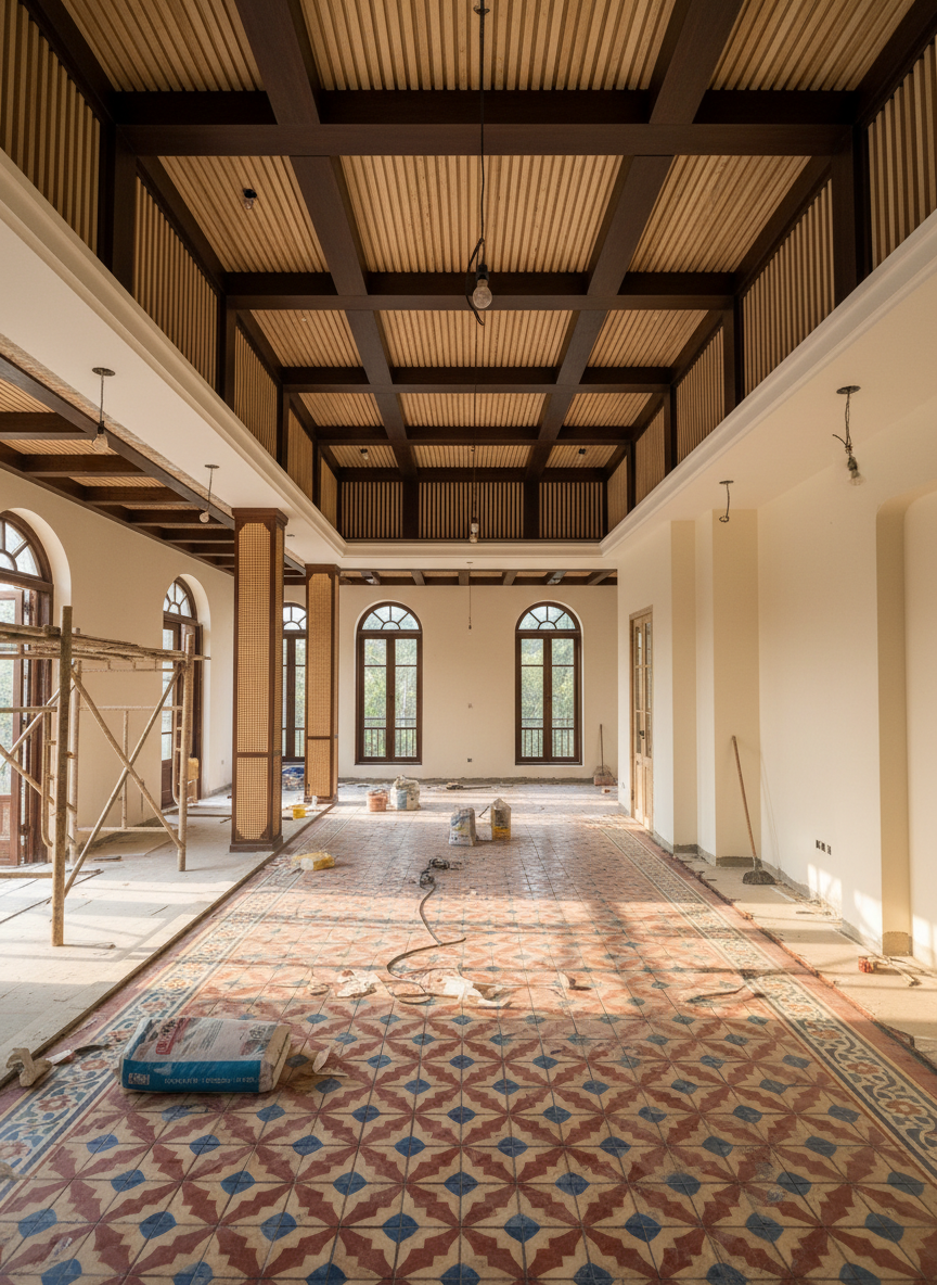 Giai đoạn thi công phần thô tập trung vào xử lý tường trần, đi lại hệ thống điện – nước, ốp gạch bông, đóng trần thạch cao. Vì phong cách Indochine yêu cầu độ sắc nét cao ở phần hoàn thiện, phần thô càng phải chính xác và chỉn chu.