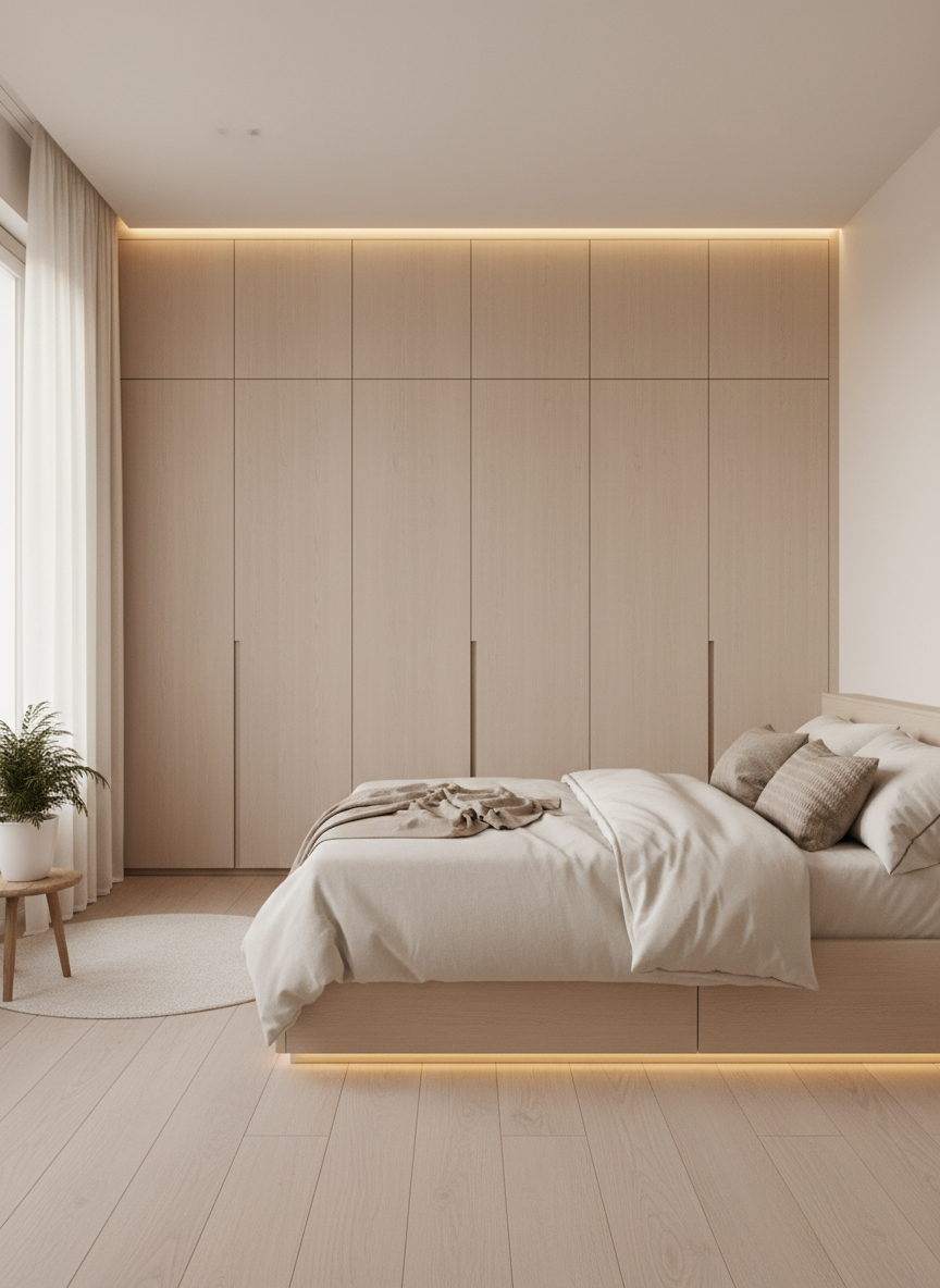 Tủ quần áo nên thiết kế âm tường, cánh phẳng và đồng màu với tường để tạo cảm giác liền lạc. Đây cũng là bí quyết mở rộng không gian hiệu quả cho nhà phố nhỏ. Tay nắm có thể được loại bỏ hoàn toàn để giữ sự tối giản, thay bằng hệ vát cạnh hoặc mở đẩy.
