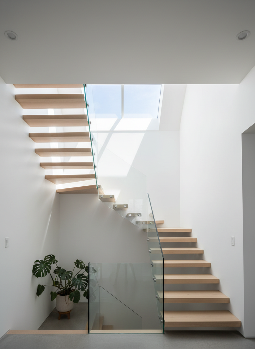 Khi hoàn thiện nội thất nhà phố, việc tận dụng ánh sáng tự nhiên là yếu tố cốt lõi tạo nên sự thông thoáng đặc trưng của phong cách tối giản. Nhà phố thường có chiều dài lớn nhưng bề ngang hạn chế, vì vậy giếng trời trở thành giải pháp tối ưu để đưa ánh sáng vào sâu bên trong không gian. Giếng trời đặt tại khu vực cầu thang, phòng khách hoặc khu sau nhà giúp toàn bộ không gian luôn thoáng, hạn chế sự bí bách.