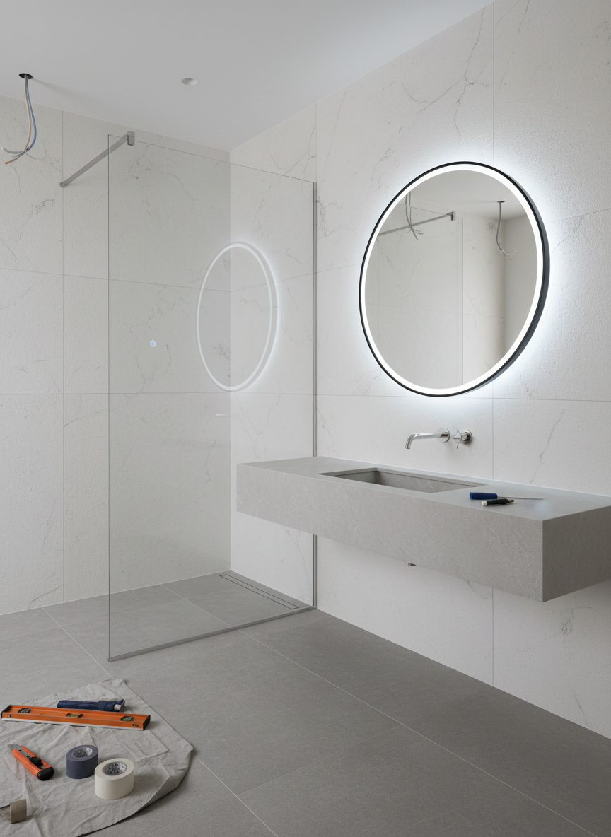 Một phòng tắm tối giản thường sử dụng đá trắng, đá xám hoặc đá be nhạt để tạo hiệu ứng rộng hơn, sạch hơn. Vách kính cường lực trong suốt không chỉ giúp phân tách khu vực khô – ướt mà còn tăng tính thẩm mỹ, khiến không gian trở nên sang trọng và hiện đại. Hệ tủ lavabo treo tường thiết kế phẳng, không tay nắm, giúp đồ dùng gọn gàng, tạo cảm giác thoáng mở. Gương tròn hoặc gương chữ nhật tích hợp đèn LED tông vàng nhẹ giúp phòng tắm trở nên ấm cúng và dễ chịu.