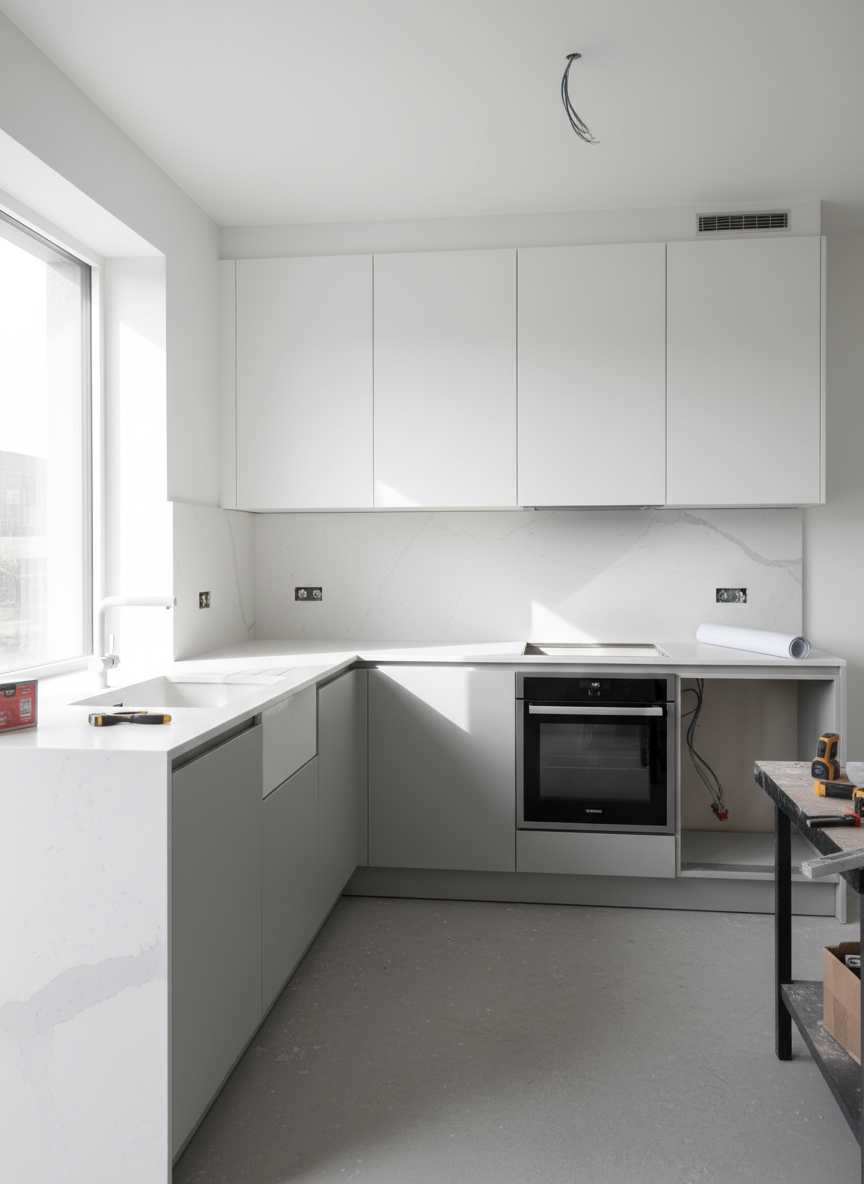 Hệ tủ bếp được thi công với mặt phẳng phẳng mịn, không tay nắm (push mở hoặc vát cạnh), màu trắng – be – ghi để giữ không gian sạch và hiện đại. Tủ trên nên làm cao kịch trần để tránh bám bụi và tăng diện tích lưu trữ. Mặt đá bếp màu trắng vân mây hoặc đá xám nhạt giúp tạo cảm giác thanh thoát.